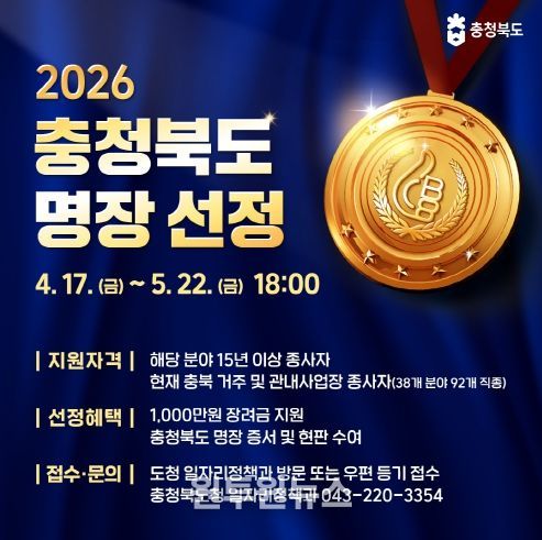 (원투원뉴스) 충북도는 산업현장에서 최고 수준의 숙련기술을 보유한 ‘2026년도 충청북도명장’을 선정한다고 17일 밝혔다.