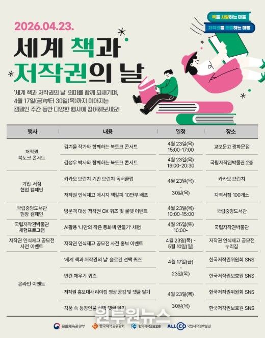 (원투원뉴스) 문화체육관광부는 한국저작권위원회, 한국저작권보호원과 함께 ‘세계 책과 저작권의 날’을 맞이해 4월 17일부터 30일까지 ‘저작권 보호 캠페인’을 추진한다. 이를 통해 책과 저작권이 지닌 소중한 가치를 되새기고, 창작자의 권리를 존중하는 문화를 국민 일상에 확산할 계획이다.