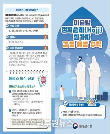 (원투원뉴스) 질병관리청은 이슬람 성지순례(하지, Hajj, 2026년 5월 25일~5월 30일 변동 가능) 시기를 맞아 사우디아라비아 방문객들에게 중동호흡기증후군(Middle East Respiratory Syndrome, 메르스) 및 수막구균 감염증(Meningococcal disease)을 주의할 것을 당부했다.
