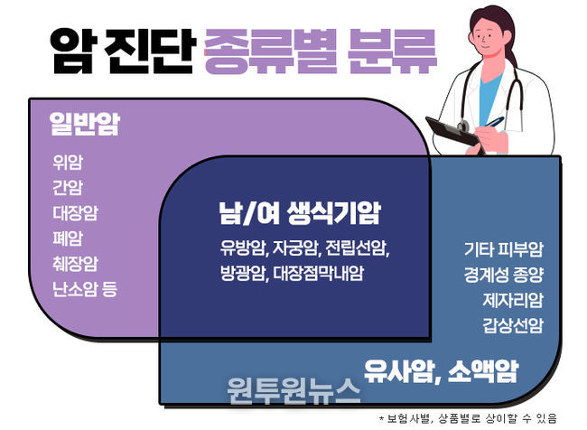 보험사에서 암을 구분할 때 보통 경계성종양, 제자리암, 갑상선암, 기타피부암 등으로 대표되는 유사암과 유방암, 방광암, 전립선암, 자궁암 등으로 대표되는 소액암, 그리고 뼈암이나 뇌암, 췌장암 등은 고액암으로 구분한다. 이들을 제외한 나머지 암은 일반암으로 분류한다. 보통 치료비가 많이 드는 고액암이 다른 암보다 진단금이 높은 편이지만, 보장을 넓게 받기 위해서는 일반암 진단비를 늘리는 것이 유리하다. 또한, 소액암이나 유사암은 발생빈도가 높고 상대적으로 치료비가 적게 들어 일반암 진단비의 약 10%~20% 정도만 지급되므로 사전에 보장금액을 알아볼 필요가 있다.