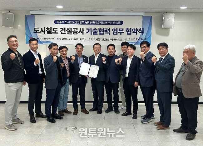 (원투원뉴스) 광주광역시 도시철도건설본부는 21일 본부 8층 대회의실에서 한국기술사회 광주·전남지회와 ‘광주시 도시철도 2호선 건설공사 기술협력 업무협약’을 체결했다.