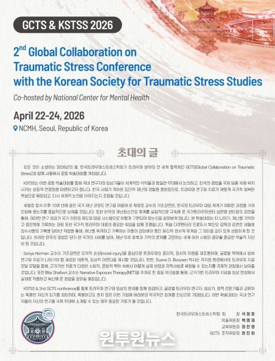 이번 학술대회는 글로벌 트라우마 스트레스 협의체 (GCTS)와 한국트라우마스트레스학회(KSTSS), 국립정신건강센터가 공동 주최하는 행사로, 외상 후 스트레스, 재난 정신건강, 근거기반 치료 확산, 지역사회 회복, 국제협력 방안 등을 논의한다.