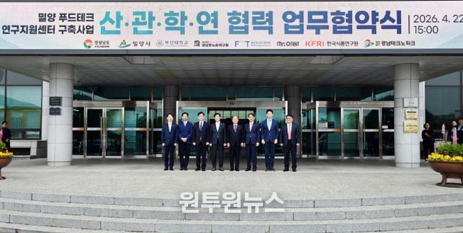 (원투원뉴스) 경상남도는 22일 밀양시청에서 ‘밀양 푸드테크 연구지원센터 구축’을 위한 산·관·학·연 협력 업무협약(MOU)을 체결하고, 농림축산식품부가 추진하는 105억 원 규모의 ‘푸드테크 연구지원센터 구축사업(스마트유통 분야)’ 공모 준비에 본격 착수했다.
