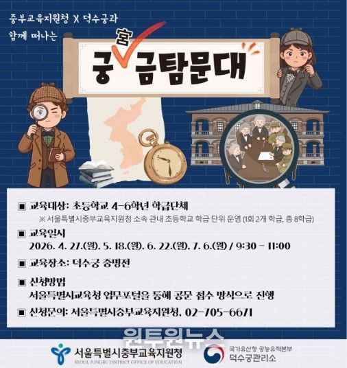(원투원뉴스) 국가유산청 궁능유적본부 덕수궁관리소는 서울특별시중부교육지원청과 함께 4월 27일부터 7월 6일까지 총 4회에 걸쳐 덕수궁 중명전(서울 중구)에서 초등학교 학급단체를 대상으로 현장체험형 국가유산 연계 교육프로그램 '궁(宮)금탐문대'를 운영한다.