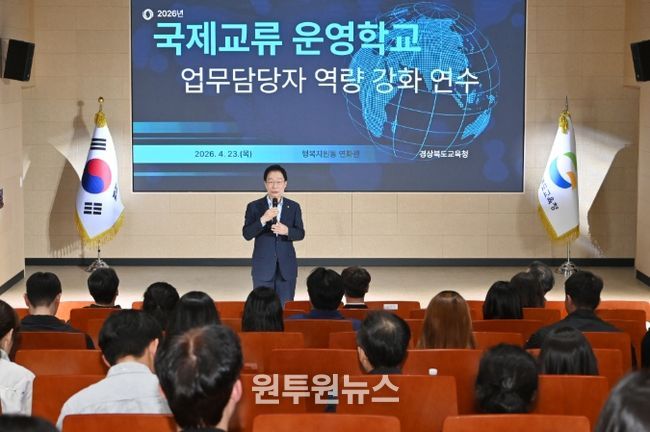 (원투원뉴스) 경북교육청은 23일 본청 행복지원동 연화관에서 도내 국제교류 운영교 업무 담당자와 관리자 등 150여 명이 참석한 가운데 ‘2026년 국제교류 운영학교 업무 담당자 역량 강화 연수’를 개최했다고 밝혔다.