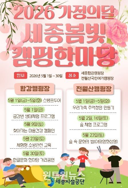 (원투원뉴스) 세종특별자치시시설관리공단은 5월 가정의 달을 맞아 합강캠핑장과 전월산국민여가캠핑장에서 가족 단위 이용객을 위한 다채로운 체험형 프로그램을 확대 운영한다고 밝혔다.