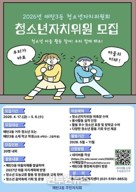 (원투원뉴스) 수원시 영통구 매탄3동은 매탄3동 주민자치회가 지역 청소년의 참여를 확대하고, 향후 지역사회를 이끌어 나갈 역량을 기르기 위해 2026년 청소년자치위원회 위원을 모집한다고 밝혔다.