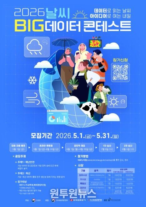 (원투원뉴스) 기상청은 ‘2026 날씨 빅데이터 경진대회(콘테스트)’를 한국전력공사, 축산물품질평가원과 함께 공동 개최한다. 날씨 경진대회를 통해 기상기후와 타 분야 데이터를 융합‧분석하여 재난 대응과 산업 활용 등 사회 현안 해결에 기여할 수 있는 창의적인 아이디어를 발굴하고자 한다.