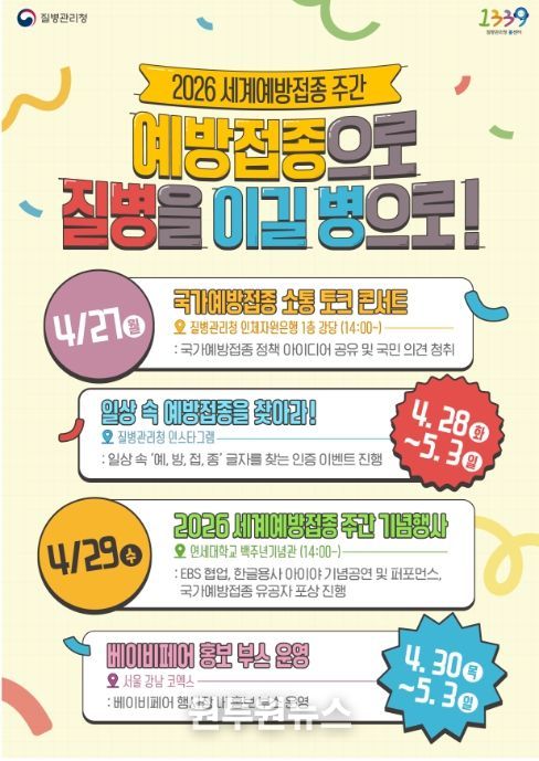 (원투원뉴스) 질병관리청은 세계보건기구(WHO)가 정한 세계예방접종주간(매년 4월 마지막 주)을 기념하여 4월 27일부터 5월 3일까지 일주일 동안'2026 예방접종주간행사'를 운영한다.