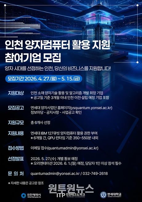 시는 연세대학교와 협력해 ‘2026년 인천 양자컴퓨터 활용 지원사업’에 참여할 기업을 모집한다.