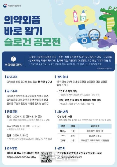 (원투원뉴스) 식품의약품안전처는 의약외품을 의약품과 구분하여 올바르게 사용할 수 있도록 ‘의약외품 바로알기 슬로건’ 공모전을 4월 27일부터 5월 24일까지 개최한다고 밝혔다.