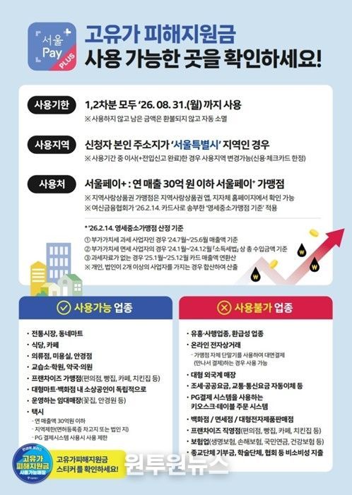 지원금은 행정안전부 지침에 따라 2026년 8월 31일까지 서울 소재 연매출 30억 원 이하 가맹점에서 사용 가능하고, 기한 내 사용하지 못한 잔액은 자동 회수된다. 또한 서울사랑상품권으로 지급된 지원금은 기존 상품권과 달리 ‘선물하기’ 기능은 제한된다.