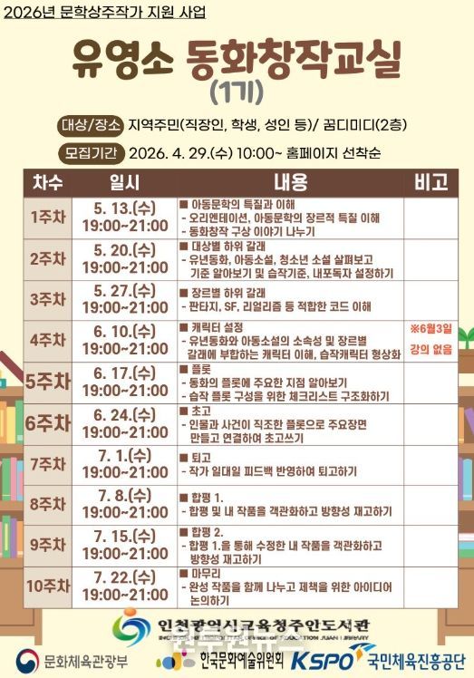 이번 강좌는 5월 13일부터 7월 22일까지 수요일 오후 7시에 진행되며, 교육 내용은 아동문학의 특성 이해부터 캐릭터 설정, 초고 작성 및 합평까지 총 10차시의 실습 중심으로 구성됐다.