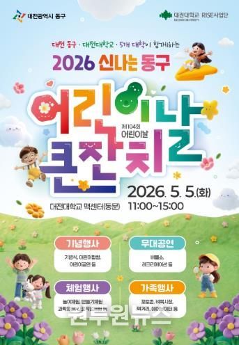 (원투원뉴스) 대전 동구는 제104회 어린이날을 맞아 오는 5월 5일 오전 11시부터 대전대학교 맥센터 실내체육관에서 ‘동구 미래의 주인공들과 함께하는 어린이날 큰잔치’를 개최한다고 28일 밝혔다.