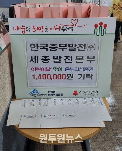 (원투원뉴스) 세종특별자치시 한솔동지역사회보장협의체가 28일 한국중부발전㈜ 세종발전본부로부터 140만 원 상당의 온누리상품권을 기탁받았다.