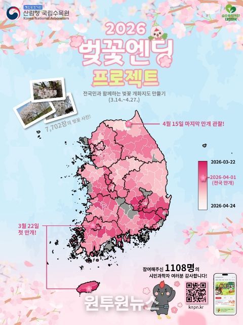(원투원뉴스) 산림청 국립수목원(원장 임영석)은 2026년 봄, 시민과학 참여 프로그램 '벚꽃엔딩 프로젝트'를 통해 국민과 함께 전국 벚나무 개화 현황을 기록하고, 이를 지도 형태로 시각화한 ‘전국 벚꽃 개화지도’를 공개했다고 밝혔다.
