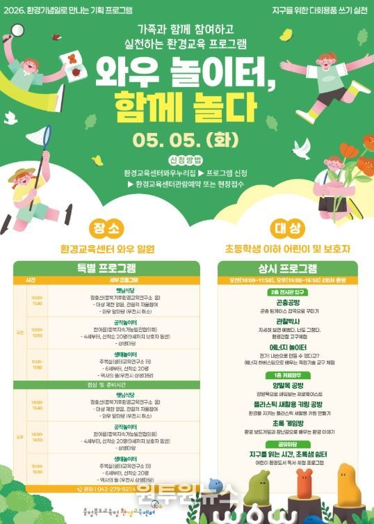 (원투원뉴스) 충청북도교육청 환경교육센터와우는 어린이날을 맞아 5월 5일 오전 10시부터 오후 4시 50분까지 센터 일원에서 '와우놀이터, 함께 놀다' 프로그램을 운영한다고 밝혔다.