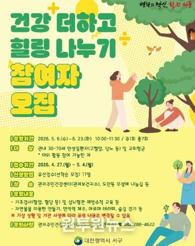 (원투원뉴스) 대전 서구는 만성질환을 앓는 주민들의 심리적 안정과 삶의 질 향상을 위한 ‘건강 더하고(+) 힐링 나누기(÷)’ 프로그램 참여자를 모집한다.