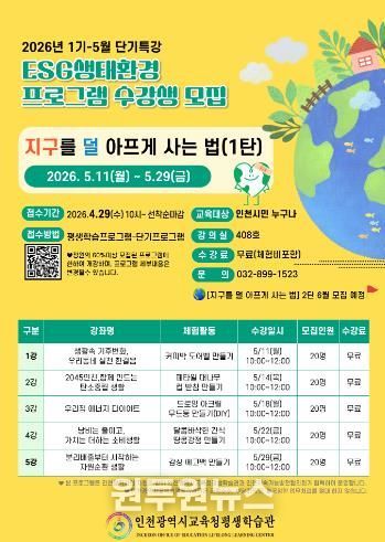 (원투원뉴스) 인천광역시교육청평생학습관은 4월 29일부터 인천시민을 대상으로 '지구를 덜 아프게 사는 법' ESG 생태환경 프로그램 1기 수강생을 모집한다.