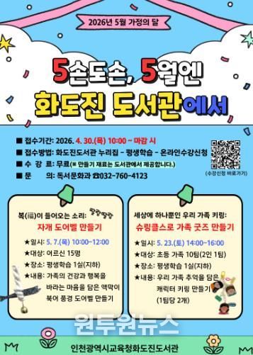 (원투원뉴스) 인천광역시교육청화도진도서관은 5월 가정의 달을 맞아 유·초등생 동반 가족과 어르신을 대상으로 세대 맞춤형 프로그램 ‘5손도손, 5월엔 화도진도서관에서’를 운영한다.