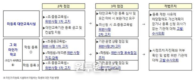마지막으로 폐쇄명령 위반 시 이행강제금 도입, 법 위반사항 공표제도 등 인가받지 않고 사실상 학교 형태로 운영하는 시설에 대한 실효적인 제재를 위해 제도개선 방안을 마련한다. 이와 더불어 체계적인 점검·관리 계획의 수립, 신고센터 설치·운영 등을 위한 법적 근거 마련도 함께 추진한다.