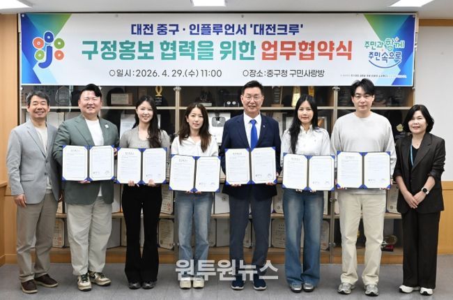 (원투원뉴스) 대전 중구는 29일 중구청 구민사랑방에서 지역 기반 인플루언서 단체인 ‘대전크루’와 온라인 구정 홍보 활성화를 위한 업무협약을 체결했다고 밝혔다.