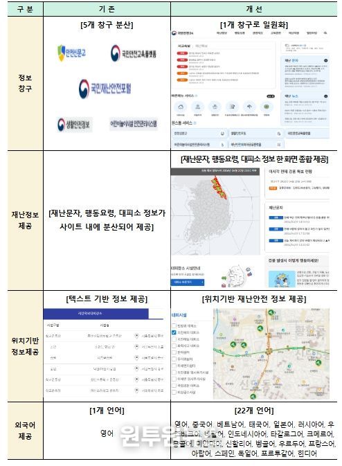 기상특보나 사고정보 등 실시간 재난상황 정보를 제공하는 재난 유형은 기존 9종에서 26종으로 확대된다. 특히 재난별 상황정보, 재난문자, 대피소 위치, 국민행동요령을 통합 안내함으로써 위기 상황에서 국민이 신속하게 대처할 수 있도록 돕는다.