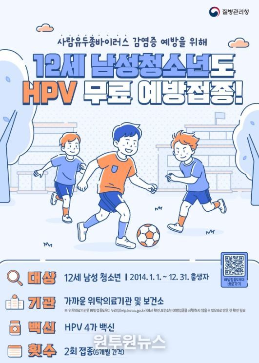 (원투원뉴스) 충북 증평군보건소가 오는 5월 6일부터 12세 남성 청소년(2014년생)을 대상으로 사람유두종바이러스(HPV) 백신 국가 예방접종 지원사업을 시작한다.