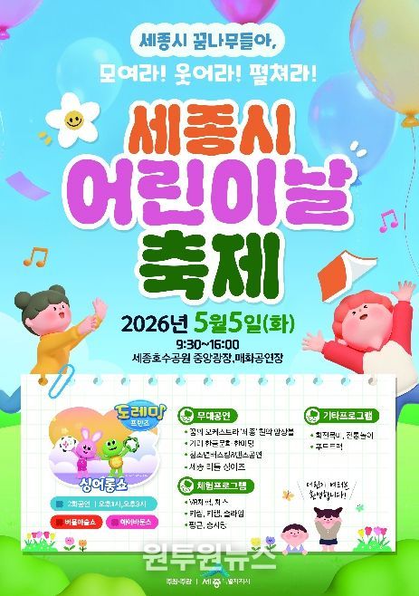 (원투원뉴스) 세종특별자치시가 오는 5월 5일 어린이날 세종호수공원 일원에서 ‘제104회 세종 어린이날 행사’를 개최한다.