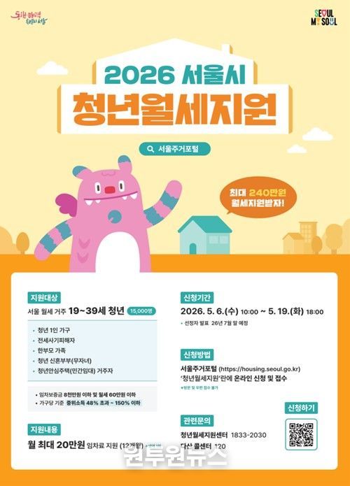 ‘2026년 청년월세지원’ 신청은 5월 6일 10시부터 5월 19일 18시까지 서울주거포털에서 온라인으로 접수하면 된다. 신청 자격은 서울시 주민등록이 된 19~39세(등본상 출생연도 1986~2007년) 무주택 청년으로, 임차인 본인이 신청해야 한다. 임차보증금 8천만 원 이하, 월세 60만 원 이하 주택 거주 시 신청 가능하다. 주택 소유자, 일반재산 1억 3천만 원 초과자, 공공임대주택 거주자, 유사 지원 사업 참여자 등은 신청에서 제외된다. 제출 서류는 임대차계약서, 월세 납부 확인서, 가족관계증명서 등이며, 신청 유형별 추가 서류가 필요하다.