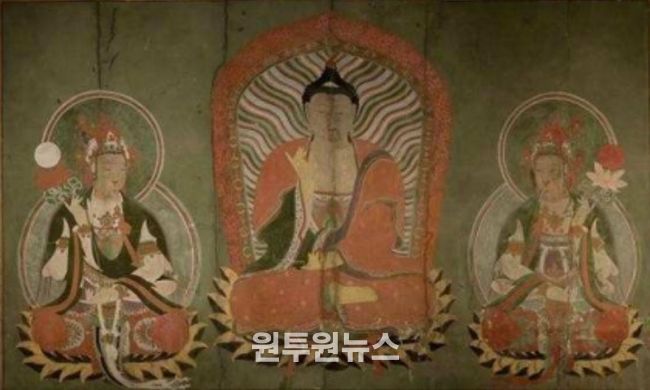 '부산 범어사 대웅전 벽화'는 대웅전 내부 동·서쪽 벽에 그려진 불화 4점으로, 한 공간에 삼불 신앙의 세계가 어떻게 구현됐는지를 보여주는 작품이다. 범어사 대웅전에는 중앙의 목조석가여래삼존좌상이 모셔진 주불단(主佛壇) 뒷벽에 걸린 영산회상도를 중심으로, 동쪽 벽에는 동방 유리광정토를 주관하는 약사여래삼존도 벽화가, 서쪽 벽에는 서방 극락정토를 주관하는 아미타여래삼존도 벽화가 배치되어 있다.