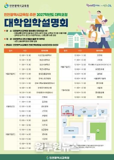 (원투원뉴스) 인천광역시교육청은 5월 30일부터 7월 4일까지 정보센터 대회의실에서 2027학년도 대학입학설명회를 개최한다.