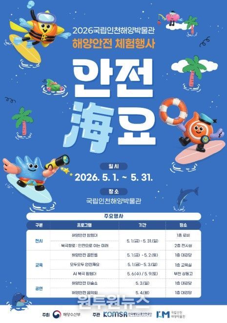 (원투원뉴스) 해양수산부와 국립인천해양박물관, 한국해양교통안전공단은 바다주간(5월 1일~5월 31일)과 가정의 달을 맞아 5월 한 달간 국립인천해양박물관에서 해양안전 체험행사 '안전해(海)요'를 운영한다고 밝혔다.