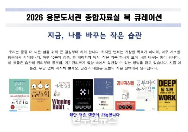 (원투원뉴스) 양평군은 5월 2일부터 6월 30일까지 용문도서관 종합자료실에서 ‘지금, 나를 바꾸는 작은 습관’을 주제로 도서 추천 서비스(북 큐레이션)를 운영한다고 밝혔다.