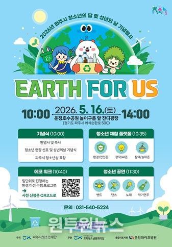 (원투원뉴스) 파주시청소년재단 교하청소년문화의집에서는 청소년의 건강한 성장과 성년의 의미를 되새기기 위해 2026년 5월 16일 '청소년의 달 및 성년의 날 기념행사 ‘EARTH FOR US’'를 개최한다.