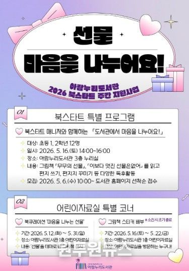 (원투원뉴스) 고양특례시 아람누리도서관이 2026 북스타트 주간 지원사업 공모에 선정돼, 오는 5월 12일부터 31일까지 ‘선물: 마음을 나누어요!’ 프로그램을 운영한다.
