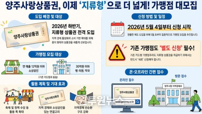 (원투원뉴스) 경기 양주시는 지역 내 소비 활성화를 위해 2026년 하반기 지류형 양주사랑상품권 도입을 추진하고, 이에 앞서 관내 가맹점 모집에 나선다고 밝혔다.
