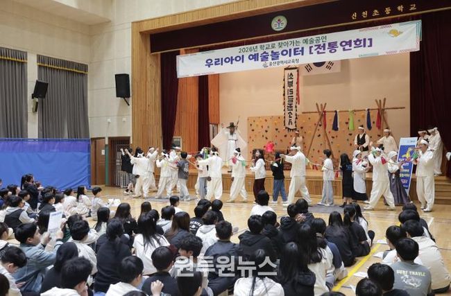 (원투원뉴스) 울산광역시교육청이 지난 30일 북구 신천초등학교에서 울산의 무형유산 ‘울산 쇠부리 소리’ 공연을 열었다.