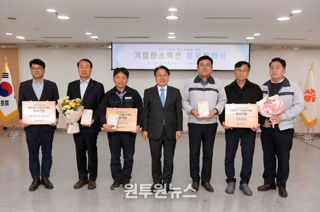 광주광역시(시장 강기정)는 30일 시청 중회의실에서 지역 기업의 온실가스 감축을 지원하기 위한 ‘2026 기업탄소액션 업무협약 및 우수기업 시상식’을 개최했다.