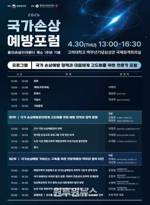 (원투원뉴스) 질병관리청은 중앙손상관리센터 개소 1주년을 맞아 4월 30일 고려대학교 백주년기념삼성관에서 「2026년 국가손상예방포럼」을 개최한다.