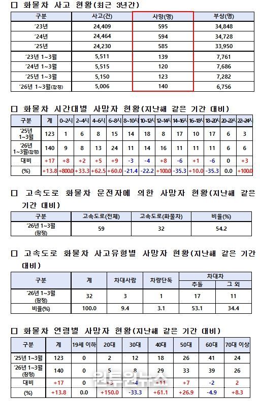경찰청 교통사고 통계에 따르면 2026년 3월까지 발생한 화물차 사망사고(잠정)는 최근 3년 같은 기간 평균(1~3월) 발생한 사망자인 127.3명보다 9.9% 증가한 수준인 140명이 발생했다.