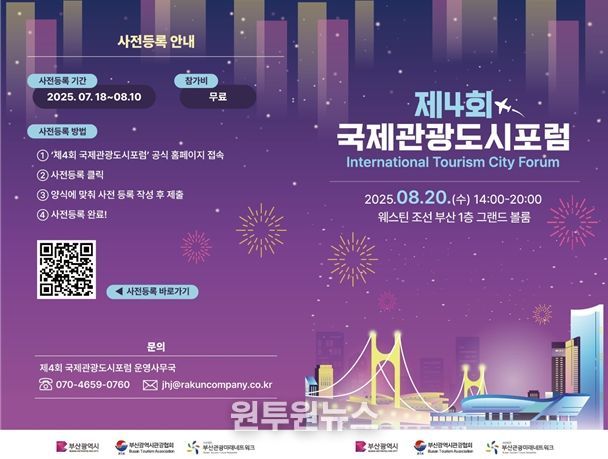 (원투원뉴스) 부산시는 20일 오후 2시 웨스틴 조선 부산(1층 그랜드 볼룸)에서 '제4회 국제관광도시 포럼'을 개최한다고 밝혔다.