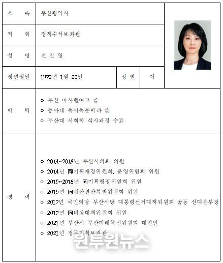 (원투원뉴스) 부산시는 9월 1일 자로 정무라인을 전면 재편하는 인사를 단행한다고 밝혔다.
