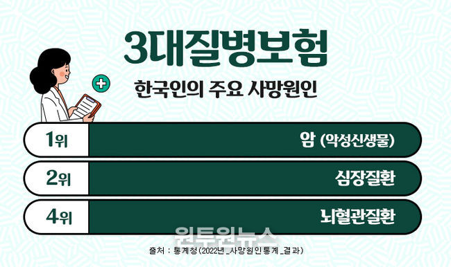 (원투원뉴스) 한국인의 주요 사망원인중에 암, 뇌혈관질환, 심혈관질환은 흔히 3대질병이라 일컬어지며 살아가면서 가장 먼저 대비해야 하는 중대질병으로 항상 강조되고 있다. 이들 질병에 미리 대비하기 위해 가입하는 것이 진단비보험인데, 이러한 3대질병진단비를 중점으로 보장하는 보장성보험이 3대진단비보험 이다. 3대질병진단비보험은 각각의 질병에 주목해서 보장하기도 하지만, 나에게 맞는 추가 특약을 잘 골라서 가입한다면 종합건강보험으로도 충분히 활용도가 높다.