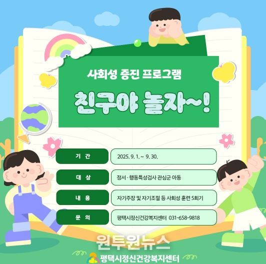 (원투원뉴스) 평택시는 9월 한 달 동안 ‘학생 정서·행동 특성검사’ 관심군으로 분류된 초등학교 1학년 아동을 대상으로 사회성 증진 프로그램 『친구야, 놀자!』를 운영한다고 밝혔다.