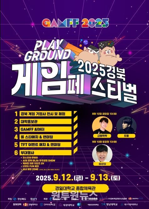 (원투원뉴스) 경상북도는 12일부터 13일까지 양일간 경일대학교 종합체육관에서 지역의 게임과 ‘경상북도 AI 메타버스 영상제’(GAMFF) 수상작을 소개하고 도민들에게 다양한 체험 기회를 제공하는 ‘2025 경북 게임 페스타’를 개최한다.