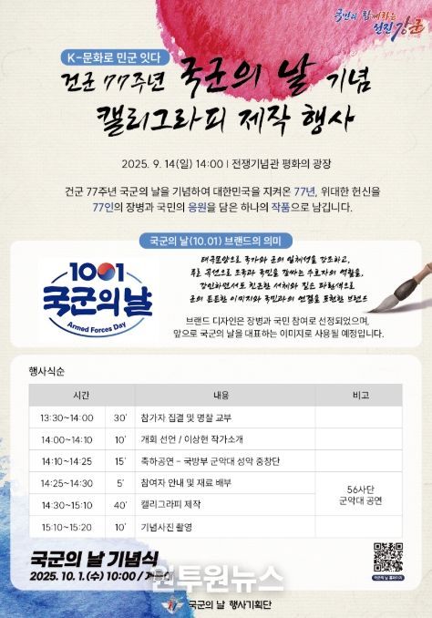 (원투원뉴스) 건군 77주년 국군의날 행사기획단은 9월 14일 오후 2시, 용산 전쟁기념관 평화의 광장에서 '국군의날 기념 대형 캘리그라피 제작 행사'를 개최한다고 밝혔다.