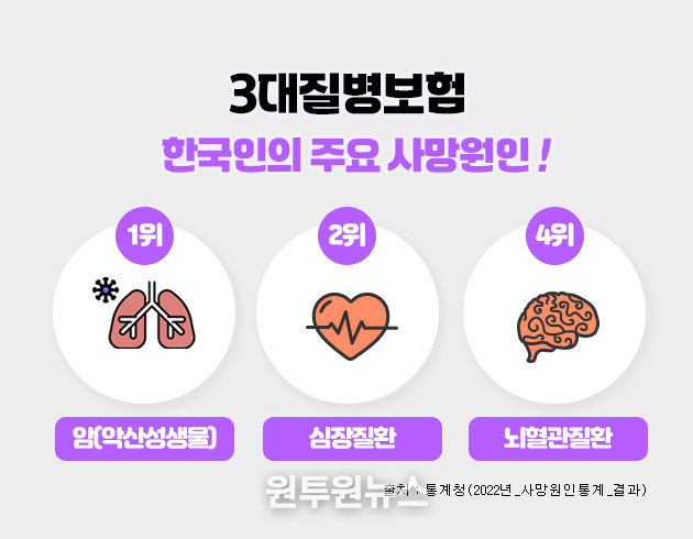 (원투원뉴스) 흔히 3대질병이라 일컫는 암, 심혈관질환, 뇌혈관질환은 통계청 발표자료에 따르면 한국인의 주요 사망원인 중에서 3위 폐렴을 제외하고 1~4위를 차지하고 있으며, 이전부터 지금까지도 살면서 가장 먼저 대비해야 하는 치명적인 질병으로 강조되고 있다. 이러한 중대질병에 대비하기 위하여 상기 세가지 치명적인 질병을 집중보장하는 3대질병진단비보험을 많이 가입하고 있다. 3대진단비보험은 각각의 질병을 중점적으로 보장하면서도 가입자 특성에 맞는 특약을 추가함으로써 종합건강보험으로도 활용할 수가 있다.