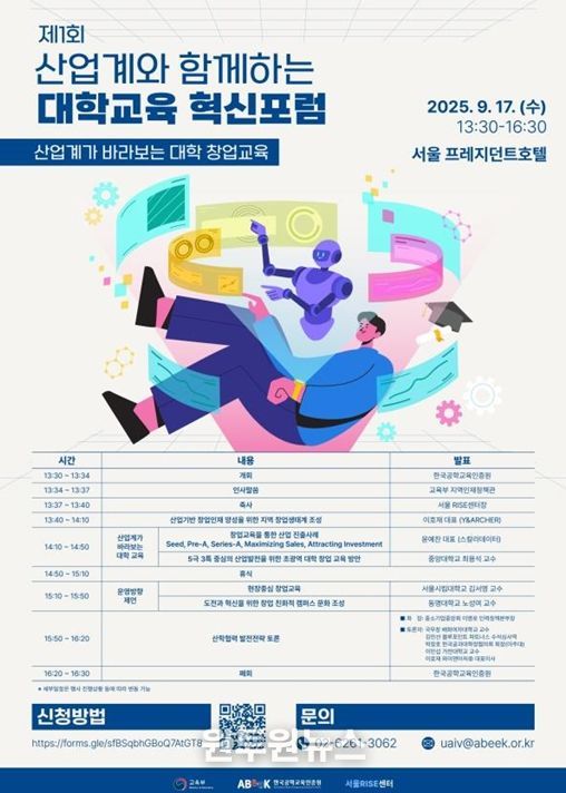 (원투원뉴스) 교육부는 한국공학교육인증원(원장 김우승), 서울 라이즈(RISE)센터(센터장 김귀영)와 함께 9월 17일, 서울 프레지던트 호텔에서 ‘제1회 산업계와 함께하는 대학교육 혁신포럼’을 개최한다.