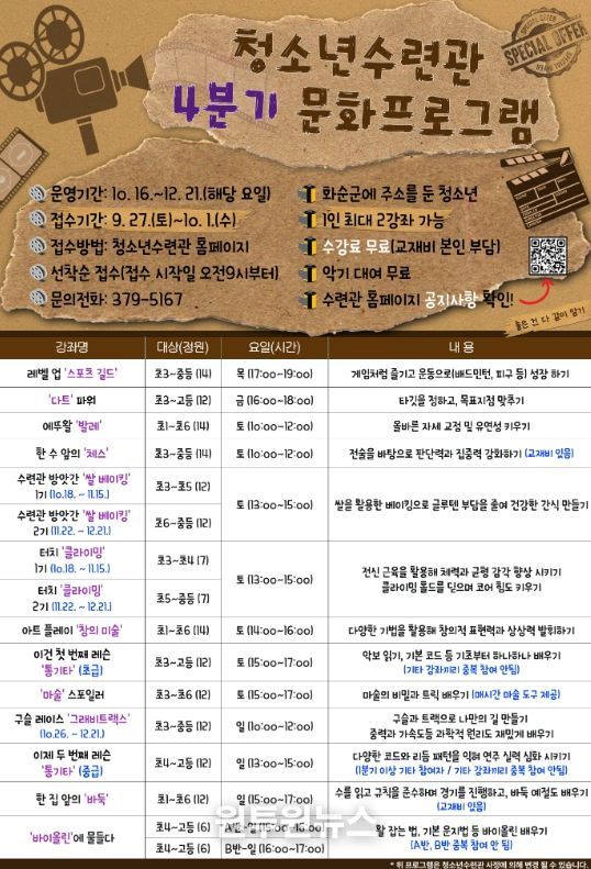 4분기 프로그램은 10월 16일부터 12월 21일까지 운영되며, 화순군에 주소를 둔 청소년은 누구나 참여할 수 있고, 9월 27일(토)~10월 1일(수)까지 화순군청소년수련관 누리집 내 ‘프로그램 신청 게시판’을 통해 온라인으로 접수하면 된다. 참가 확정자는 추후 문자 안내가 발송될 예정이다.